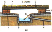 Деревянное покрытие пола выполняют по лагам, установленным на опорных столбах с применением гидроизоляции. Доски пола крепят с зазором 5-6 мм, чтобы обеспечить нормальный водослив при сильном набухании. С этой же целью на досках снимают продольные фаски, делая верхнюю пласть покатой. Полы из сплошного покрытия выполняют по тому же принципу, что и водосливное основание, но приямок при этом должен находиться в самом помещении, поэтому его покрывают водосточной решёткой. Канализацию обязательно надо оборудовать вентиляционным стояком, который для упрощения конструкции можно смонтировать на сливе из асбоцементной или металлической трубы диаметром не менее 100 мм; верхний конец её оборудуют колпаком или дефлектором.