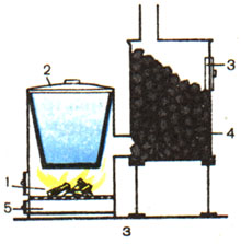 Практичную и достаточно простую в изготовлении каменку можно сделать из двух металлических бочек: одну используют как топливник, оборудовав её топочной дверкой размером 270x260 мм, поддувалом с зольником и колосниками, другую - в качестве каменки. Для увеличения долговечности колосник делают чугунным или из железа, например из арматуры диаметром 14-16 мм. Сверху топливника устанавливают бак для воды с таким расчетом, чтобы между колосниками и дном было расстояние не менее 25 см для закладки достаточного количества дров; бак оборудуют краном. Каменку устанавливают на ножки (стойки) и соединяют с топливником дымоходным патрубком диаметром 22 см. Она должна иметь дверку размером 220x160 мм для подачи воды на пар и дымоходный патрубок диаметром 150 мм.